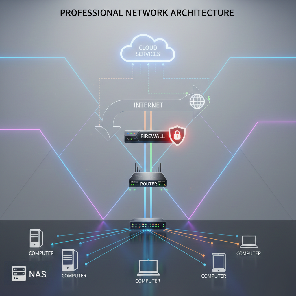 - Router (ผู้จัดเส้นทาง): รับข้อมูลจาก Firewall มาบริหารจัดการเส้นทางเพื่อส่งต่อให้เครือข่ายภายใน